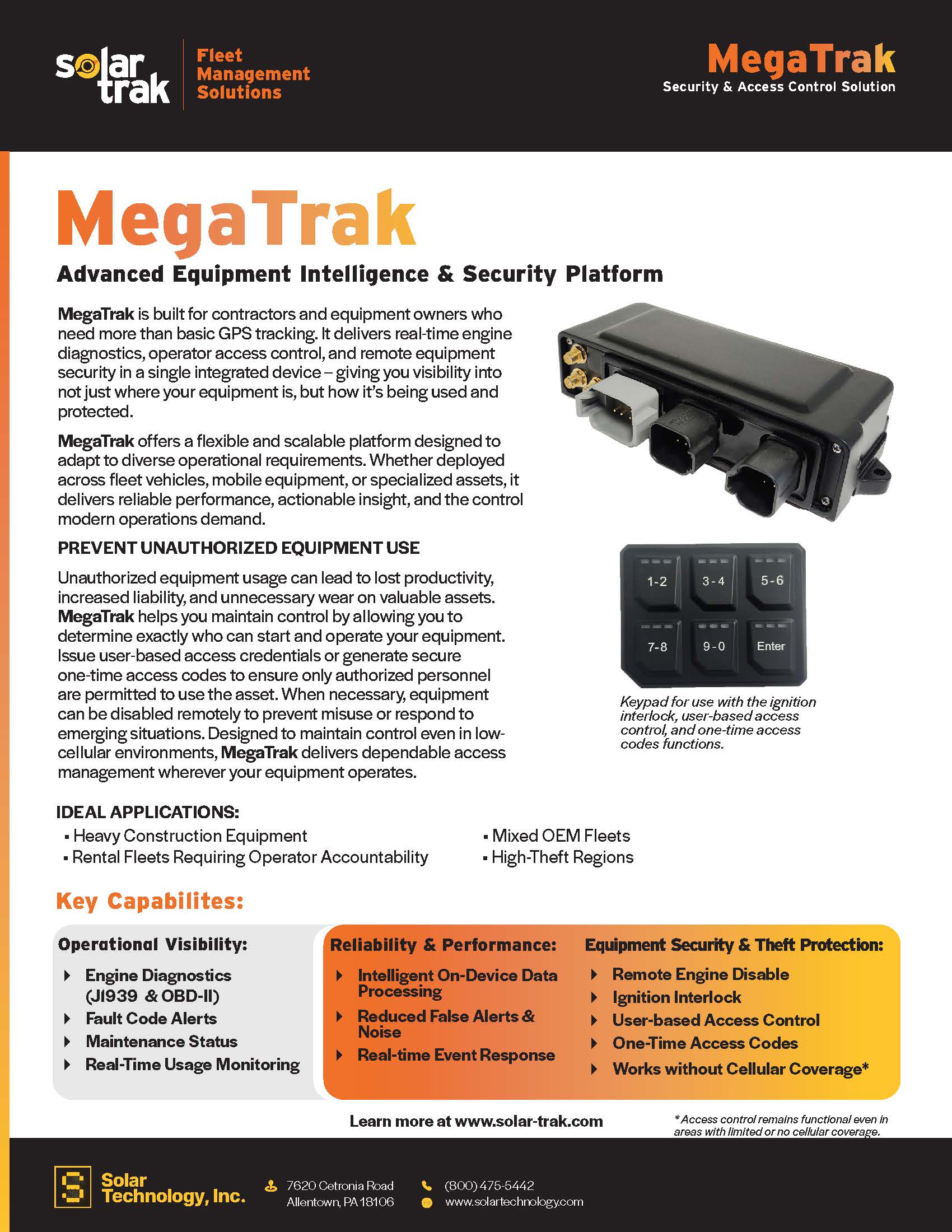 Designed as the foundation for cost-effective remote asset management solutions, MegaTrak provides a flexible and scalable telematics platform that adapts to diverse operational requirements. Whether installed on fleet vehicles, construction equipment, rental assets, or specialized machinery, MegaTrak delivers reliable performance, actionable data, and intelligent control.